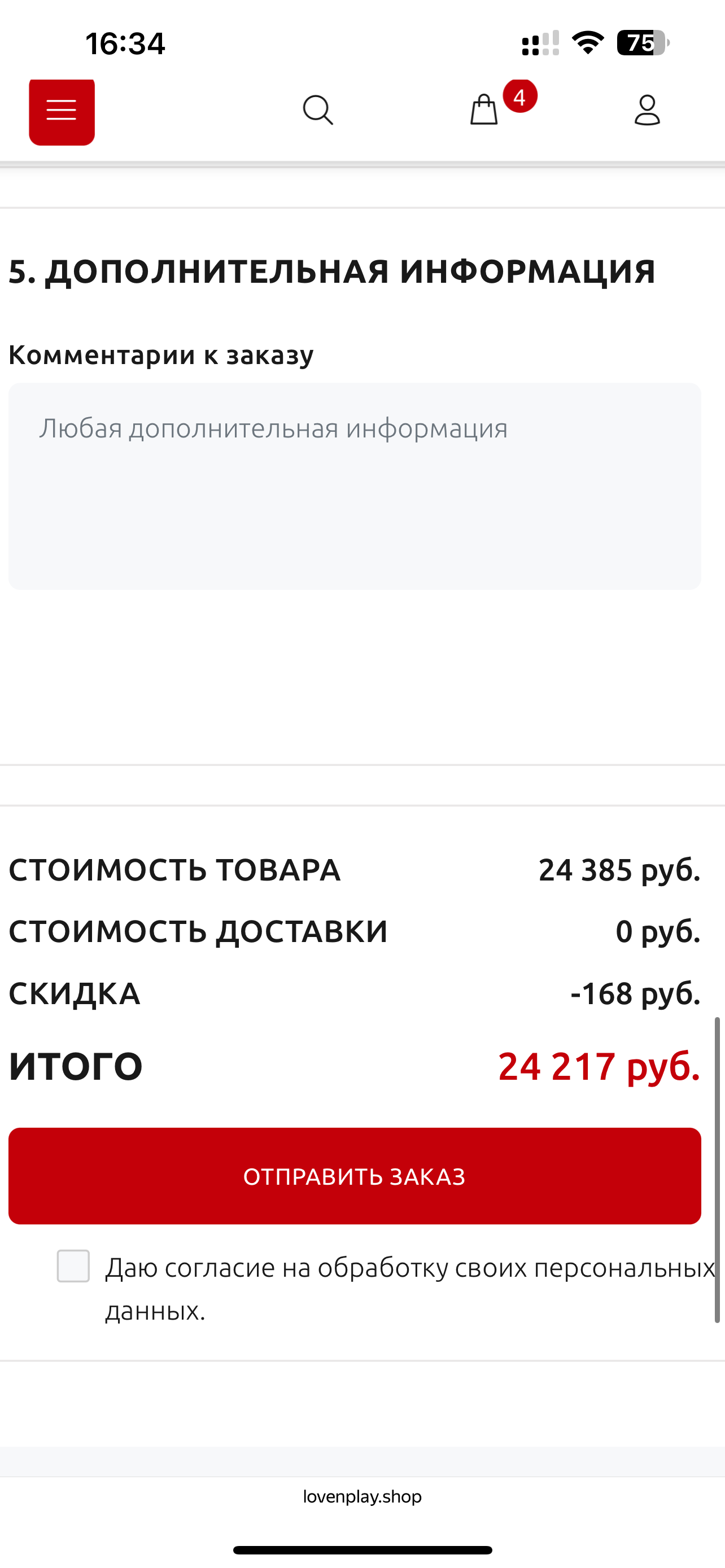 Теперь осталось лишь нажать кнопку "Отправить заказ", согласившись на предоставление персональных данных для обработки заказа.