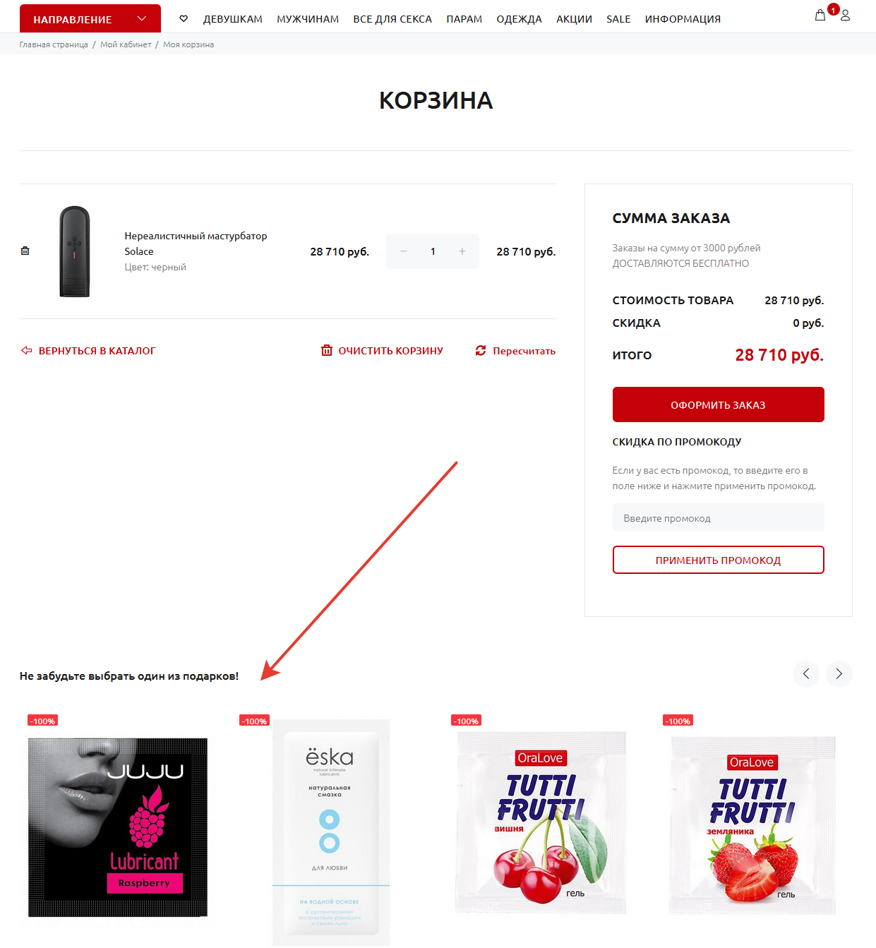 Подарок необходимо выбрать в корзине, после добавления всех необходимых вам товаров.